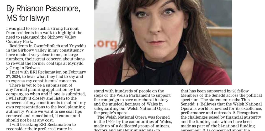 You can read my latest column for the South Wales Argus where I discuss the need to protect the Sirhowy Valley Country Park and the importance of safeguarding the future of the Welsh National Opera.